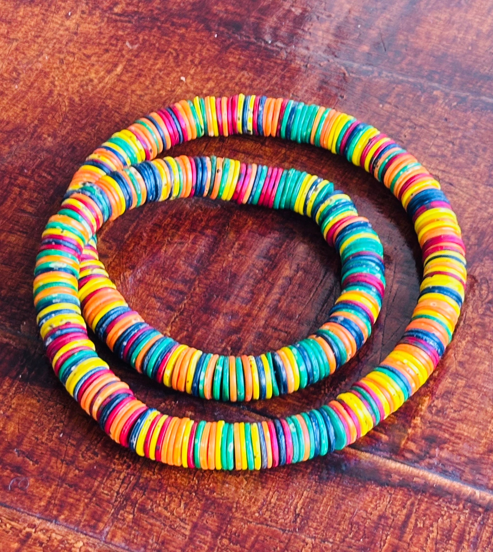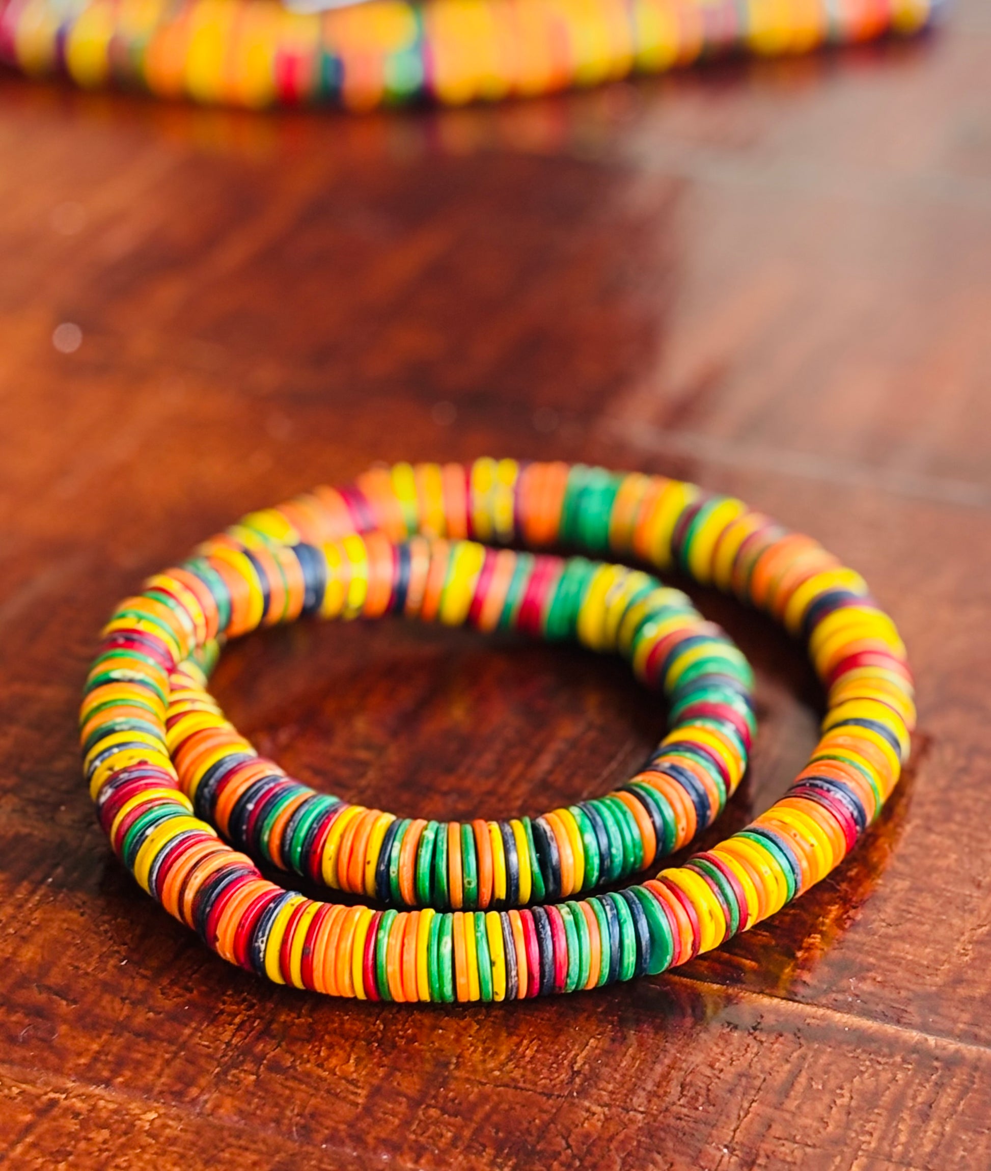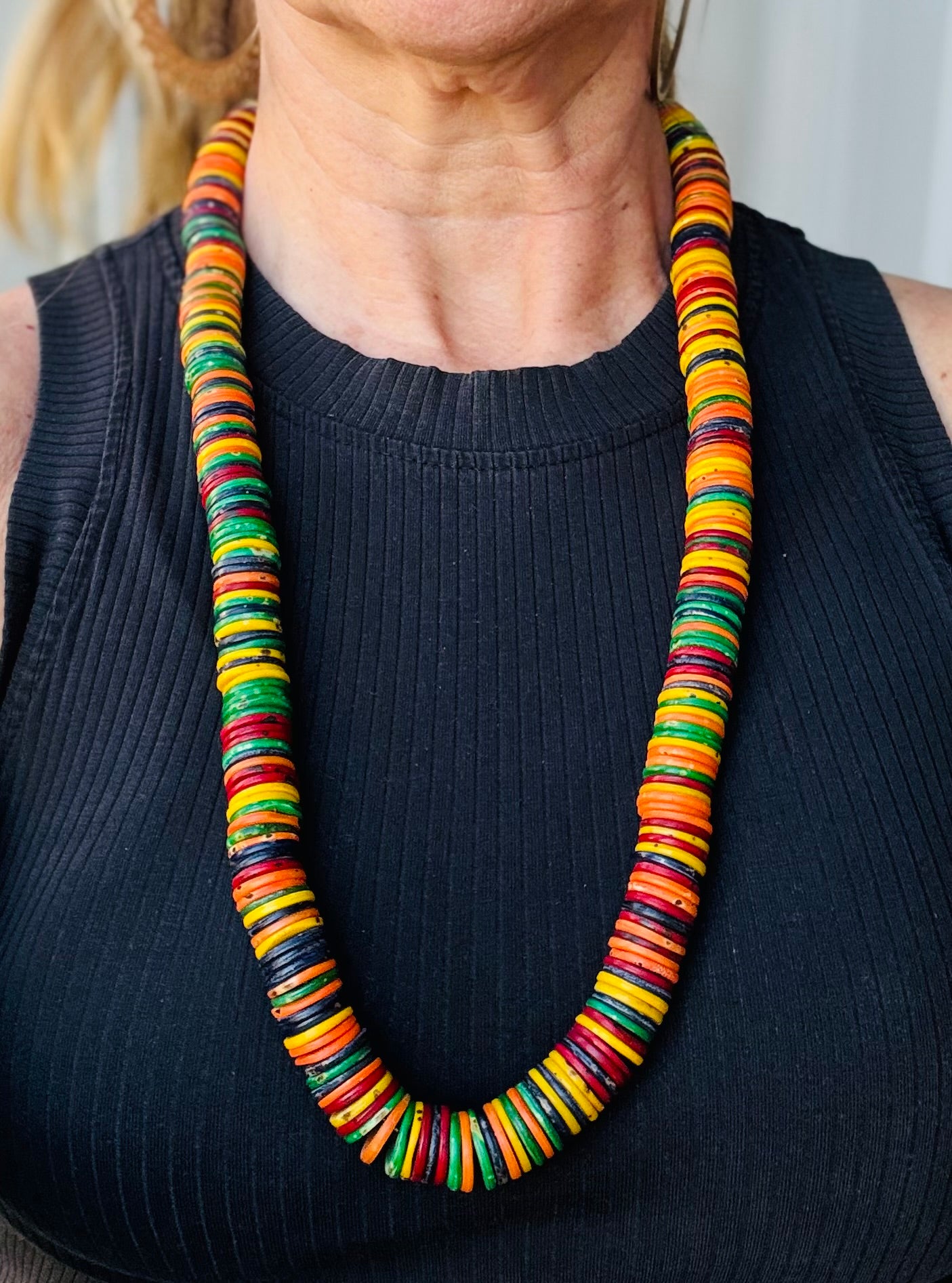Ketting van gekleurd been in warme oranje- en geeltonen. Compact en krachtig – ideaal om je outfit licht en speels te maken.