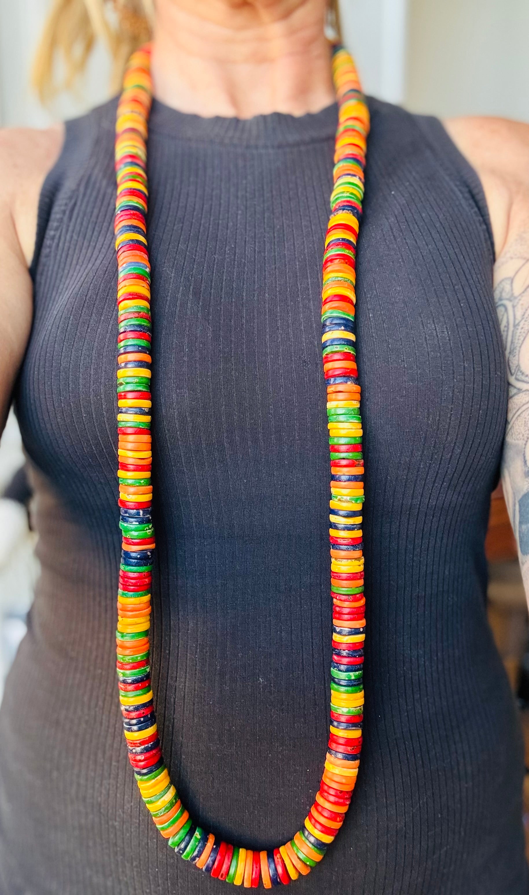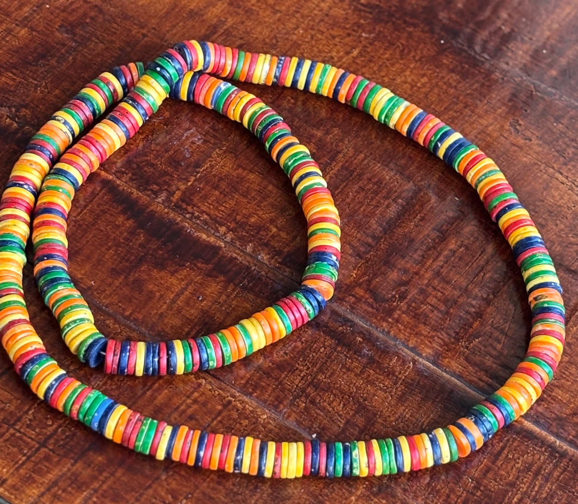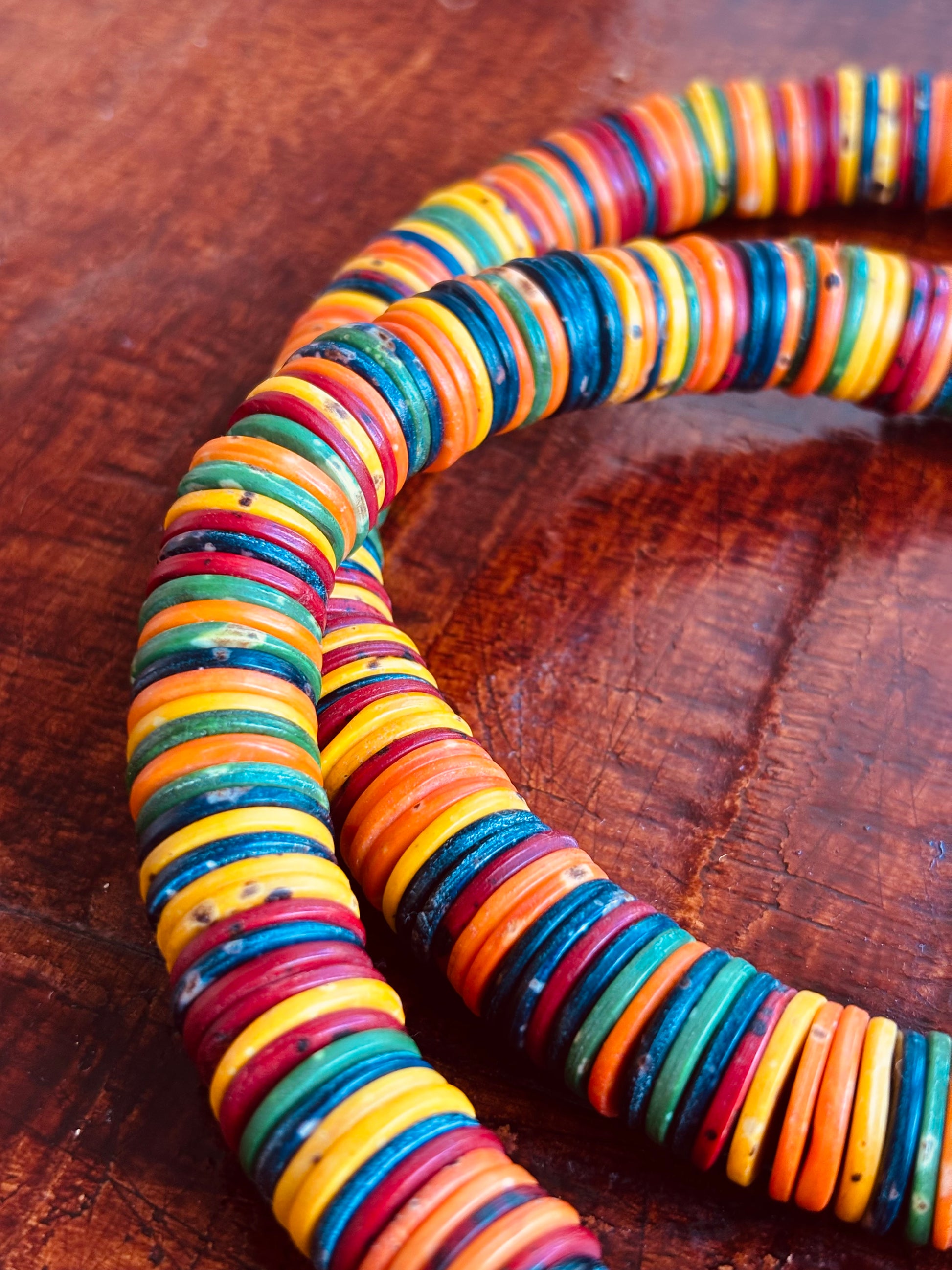 Extra lange ketting van gekleurd been in oranjetinten, rood, groen en blauw. Speels en veelzijdig – draag dubbelgeslagen of lang uitvallend.
