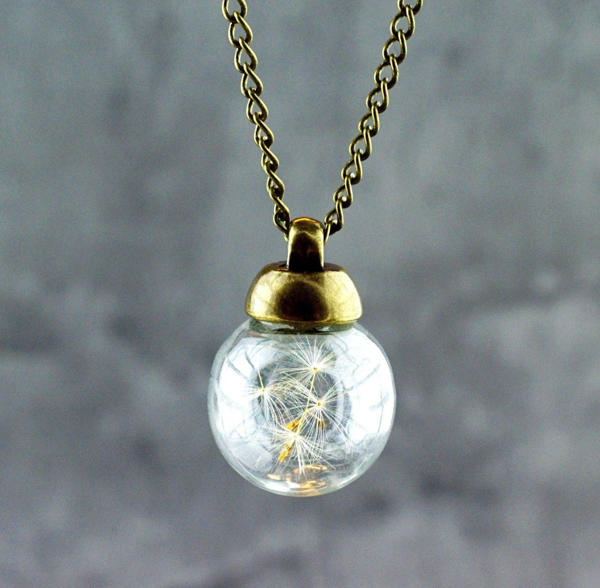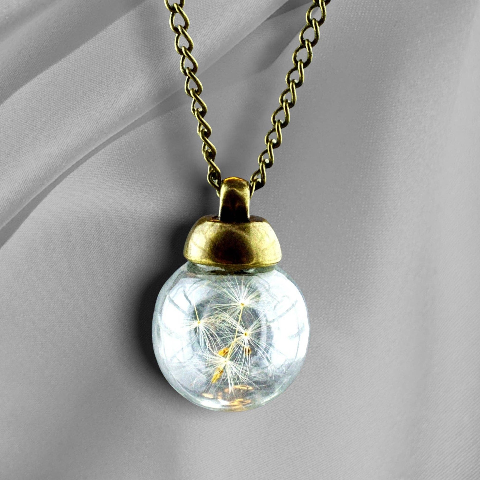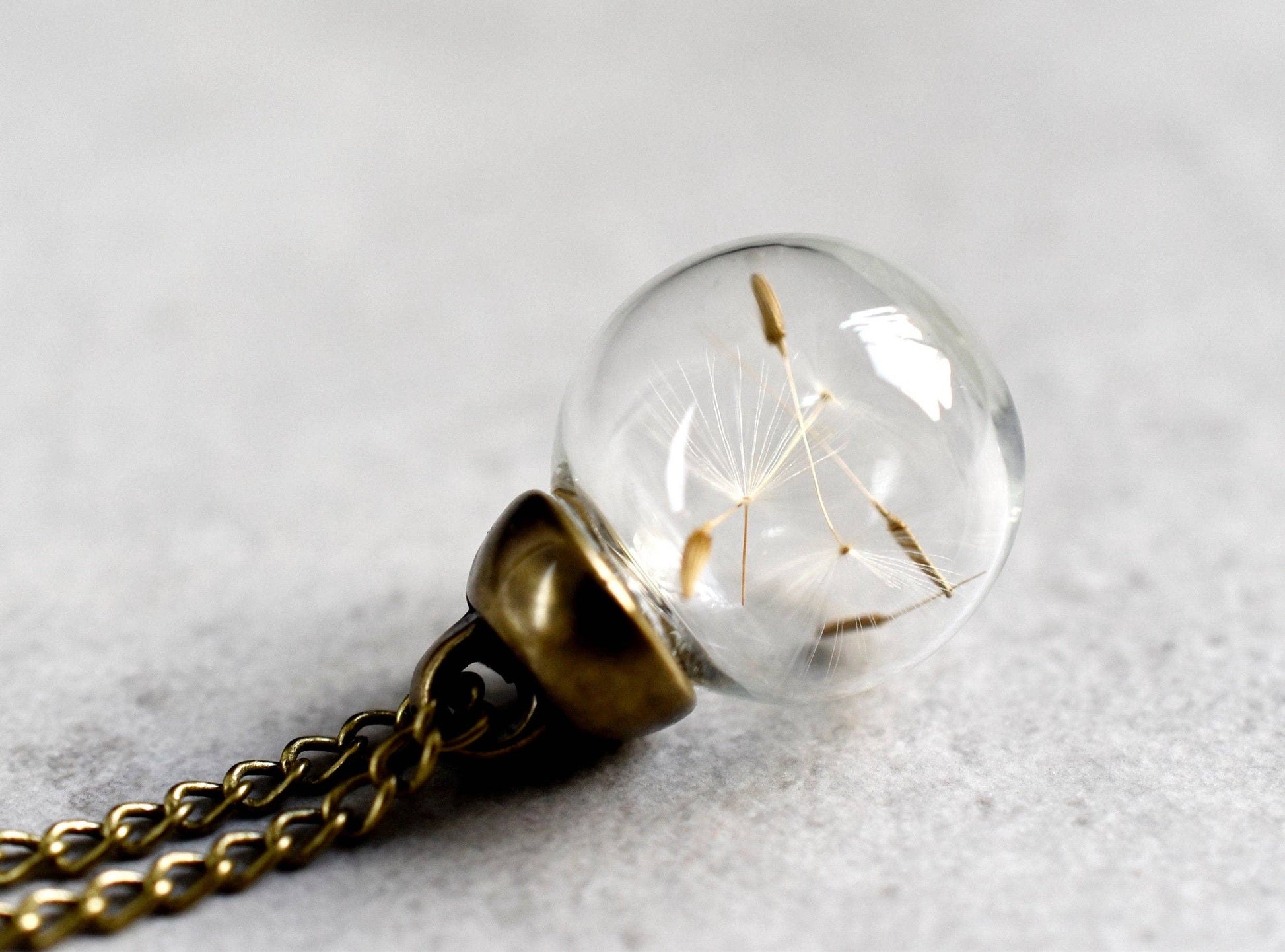 Een handgemaakte hanger met echte paardebloemzaadjes, zichtbaar in een transparante glazen bol (ca 2 cm).