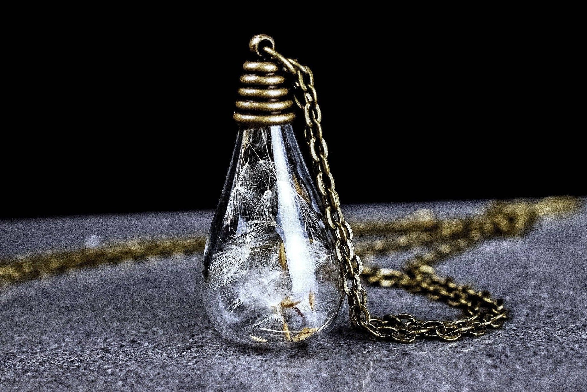 Dit is een handgemaakte halsketting met echte paardebloemzaden, zichtbaar in een transparante druppelvormige glazen hanger.