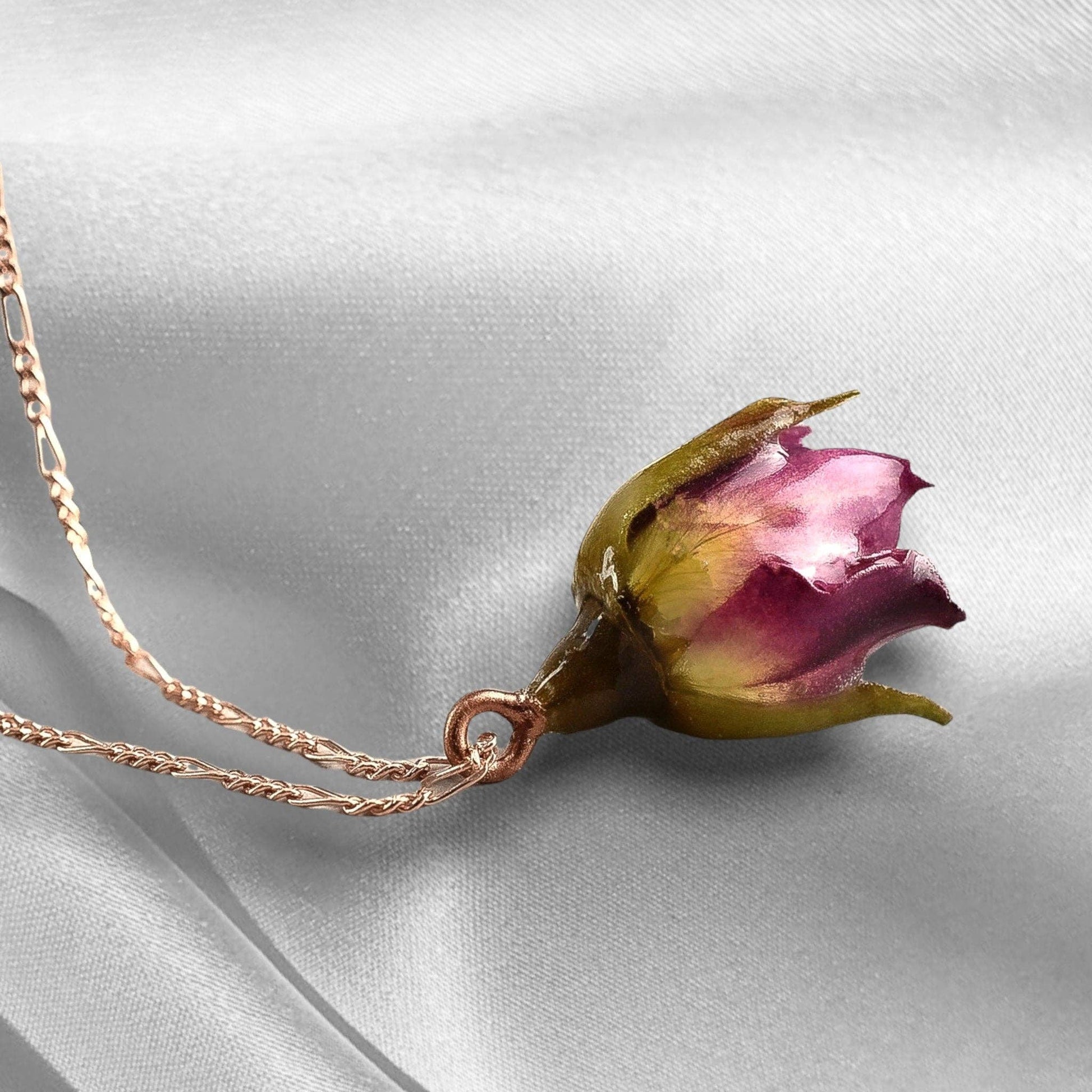 De bloem behoudt haar natuurlijke structuur en diepe paarse kleur, zonder fragiel te worden. Ze hangt aan een fijne ketting van 925 sterling zilver met roségouden plating, wat het geheel zacht en evenwichtig houdt. De combinatie van echt botanisch materiaal en edelmetaal geeft deze ketting een uitgesproken maar ingetogen uitstraling.