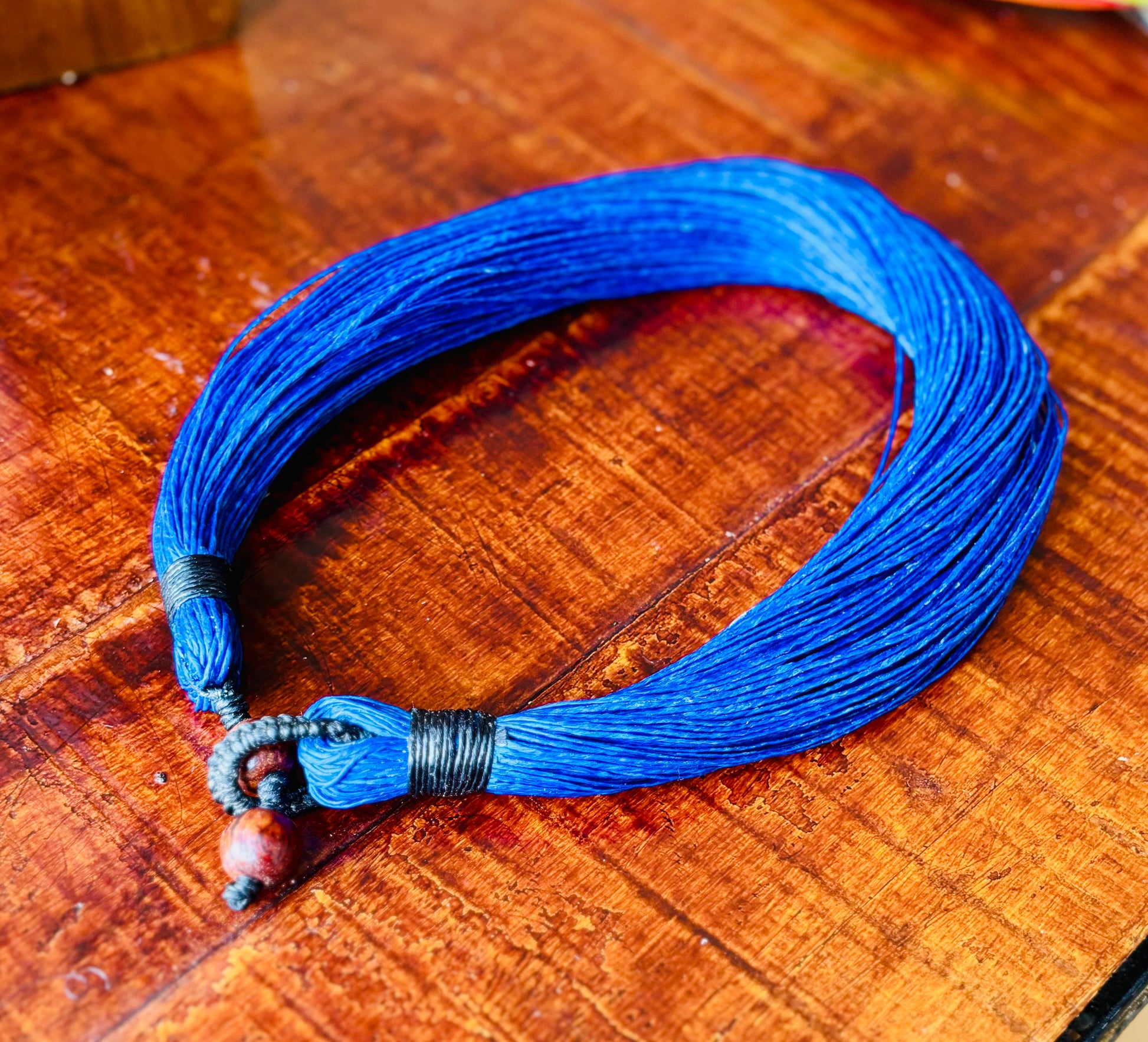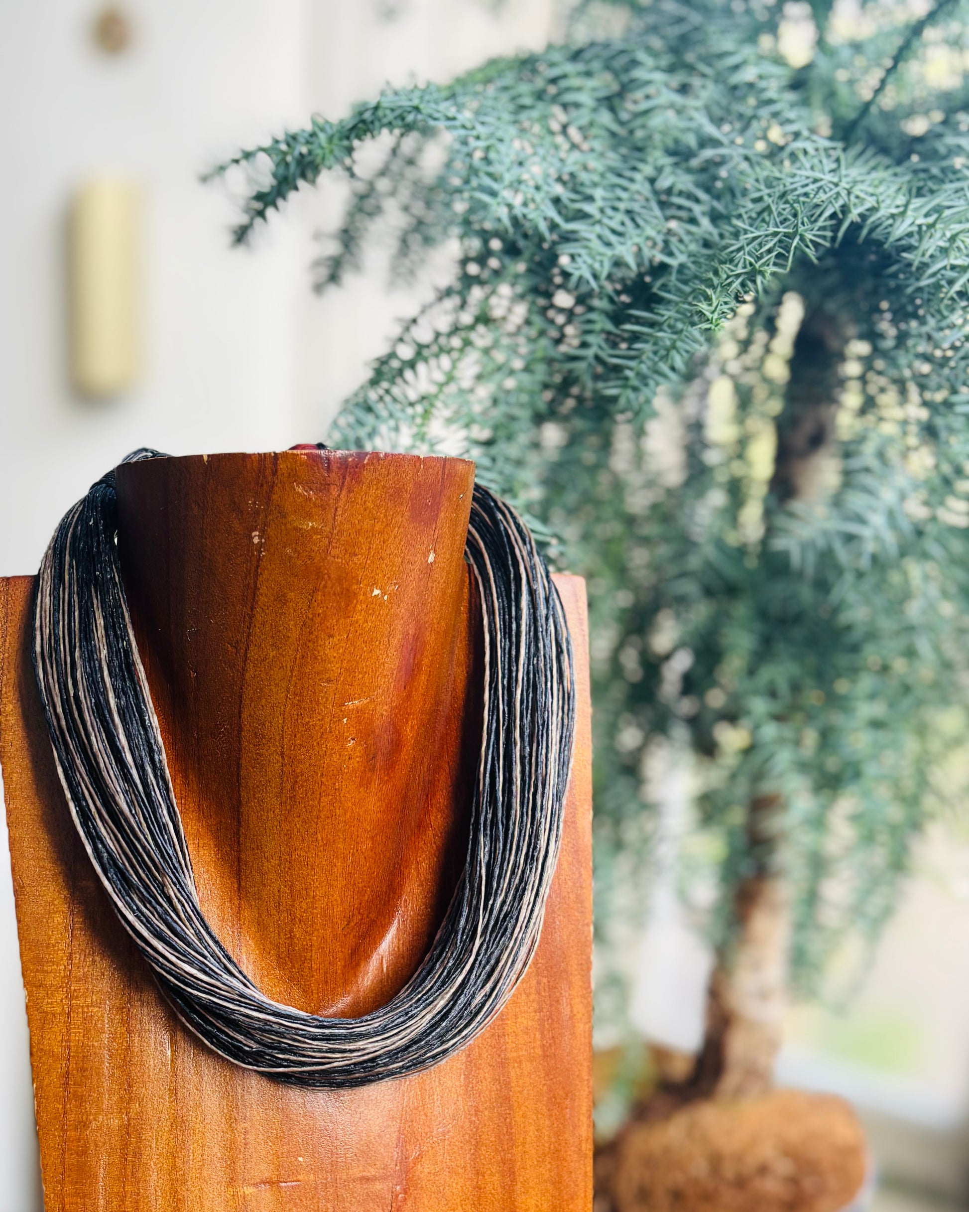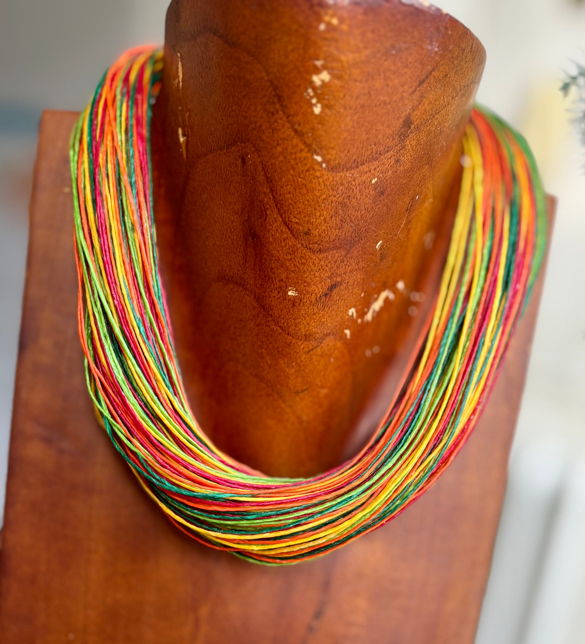 WAXA is handgemaakt in Indonesië uit tientallen strengen van gewaxt katoen – katoen dat met een fijne waslaag wordt behandeld om het te versterken, te beschermen en zijn natuurlijke glans te onthullen. Die was fixeert de kleur en geeft de draden een zachte stevigheid, waardoor de ketting tegelijk soepel én vormvast valt.