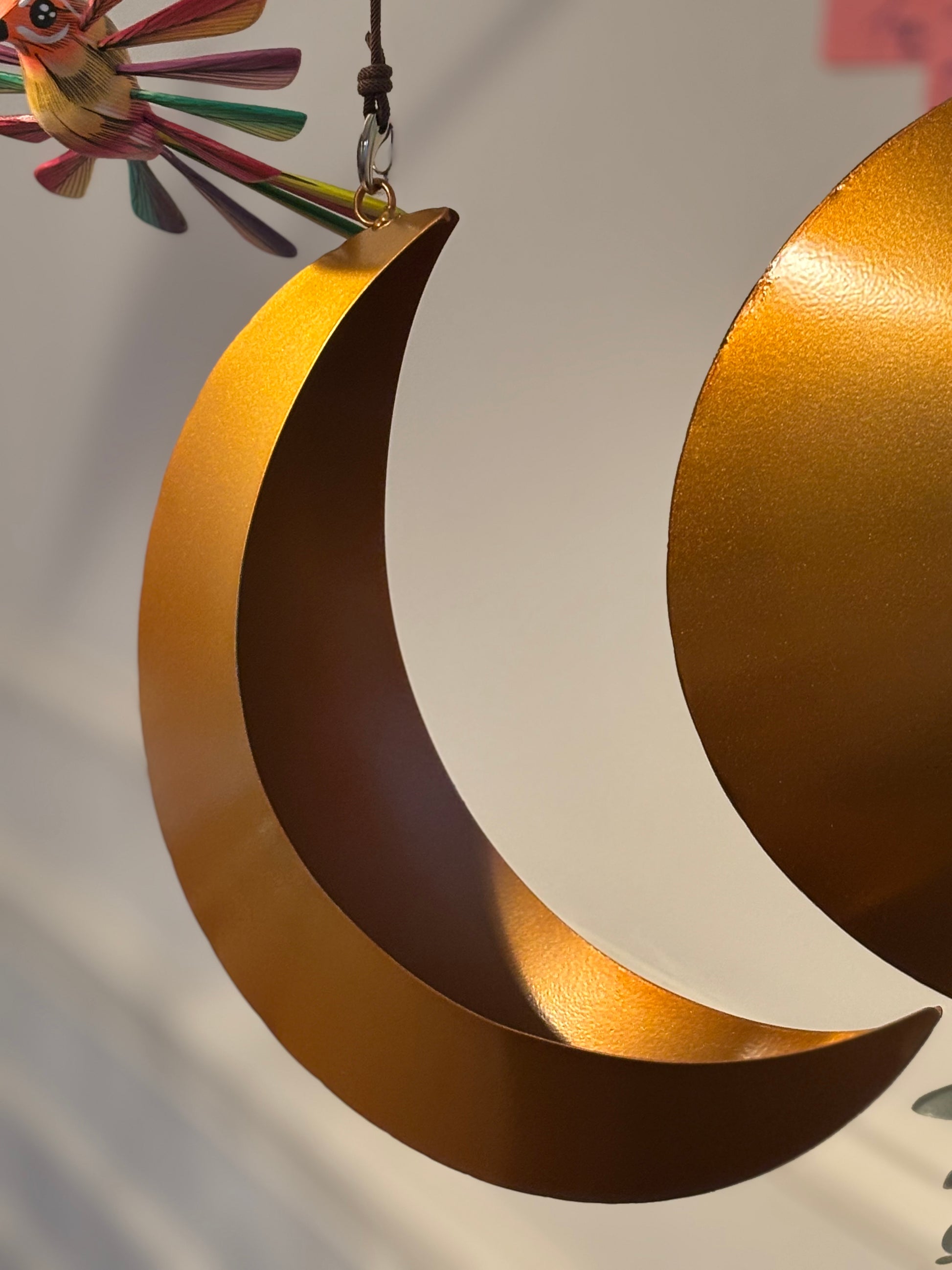 Een zachte glans, een vloeiende kromming — deze metalen maan vangt het licht en nodigt uit tot verstilling.