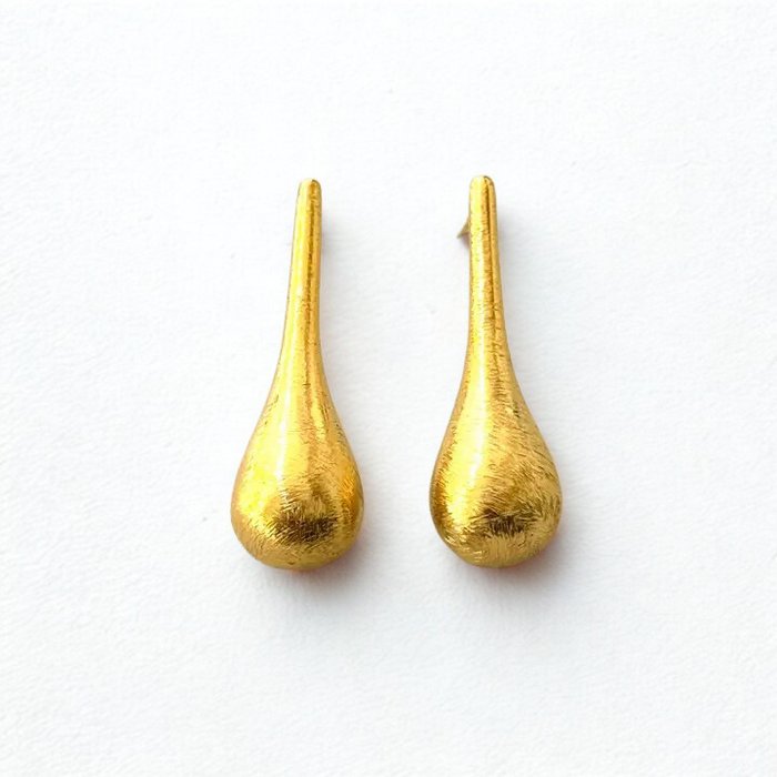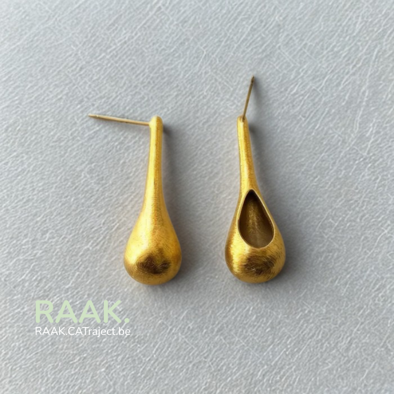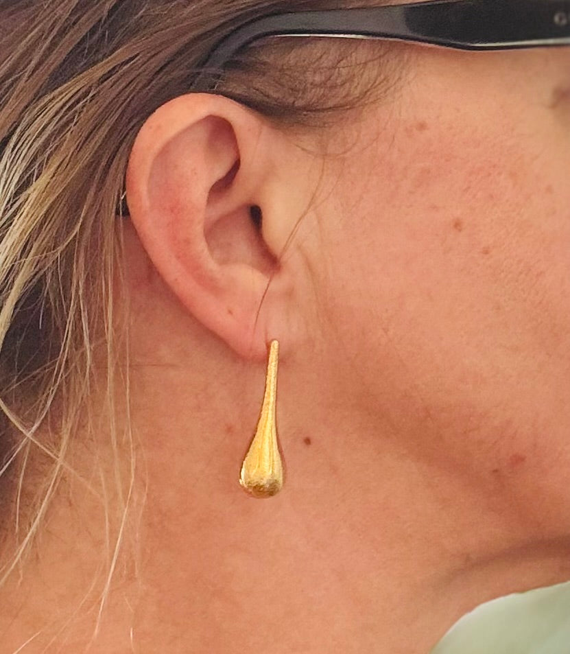 Deze oorringen in geborsteld goud heeft een zuivere, sculpturale lijn — geïnspireerd op de natuurlijke vorm van een stalaktiet. Licht, tijdloos en waterdicht: een gouden accent dat je elke dag kan dragen.