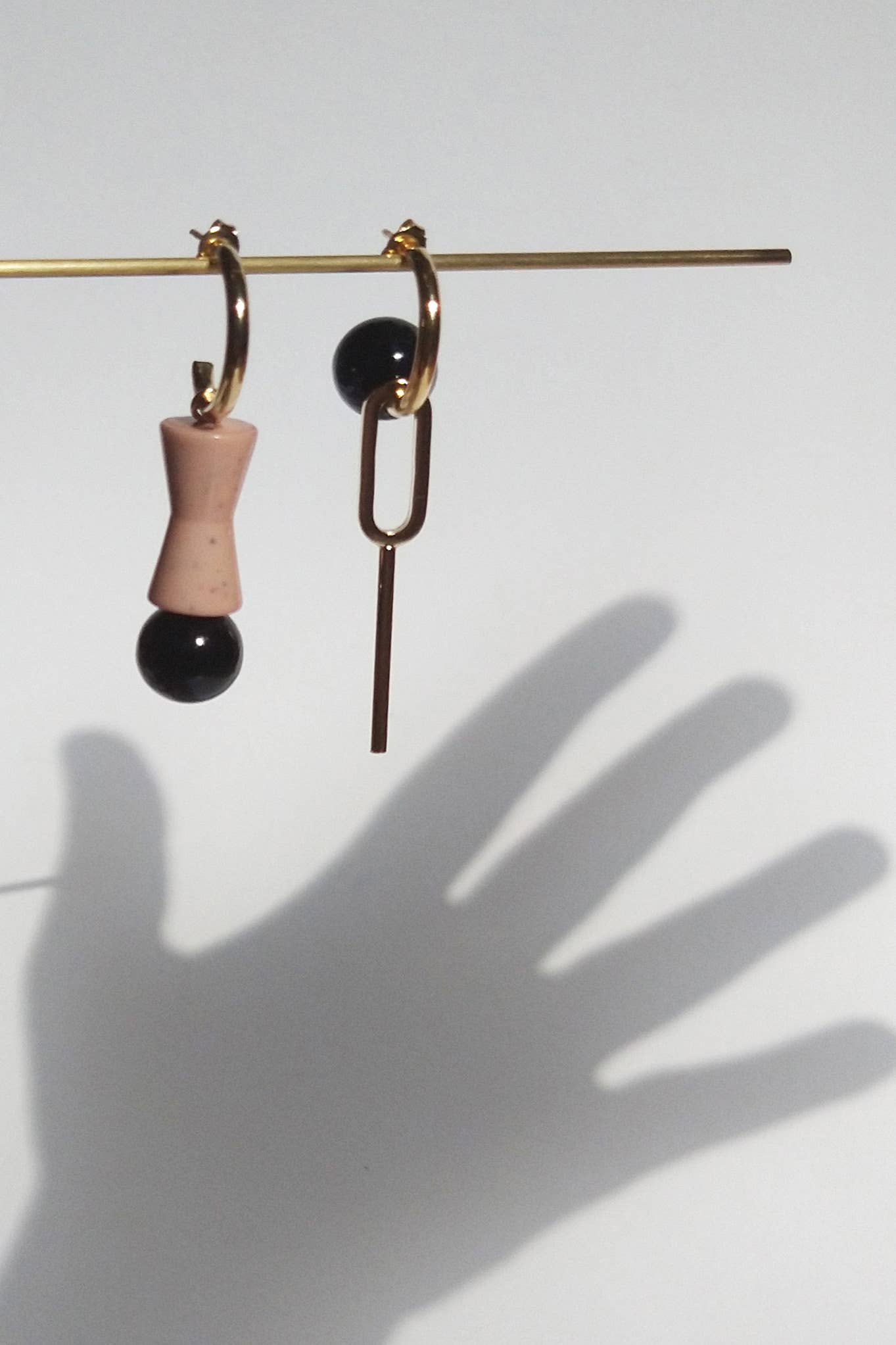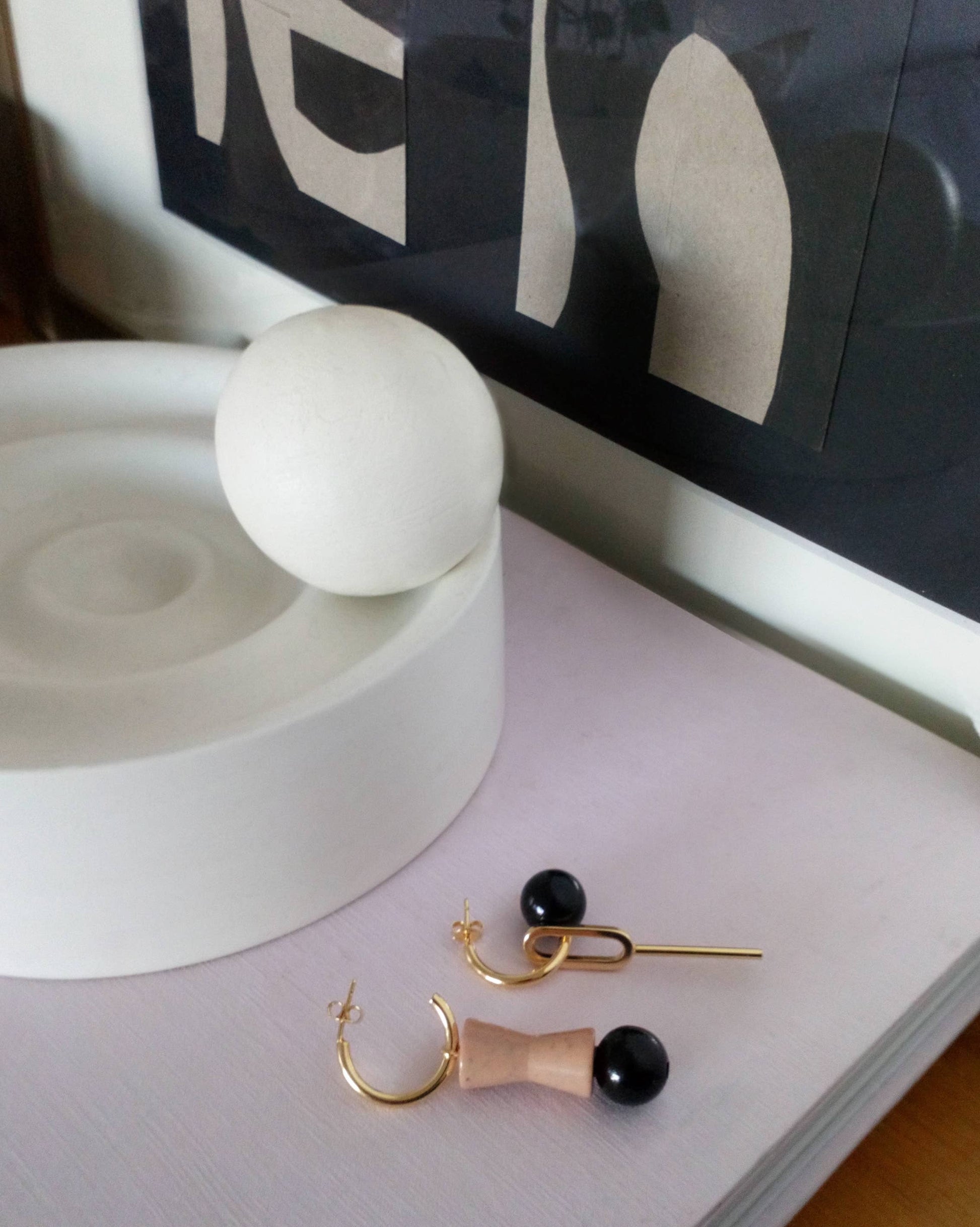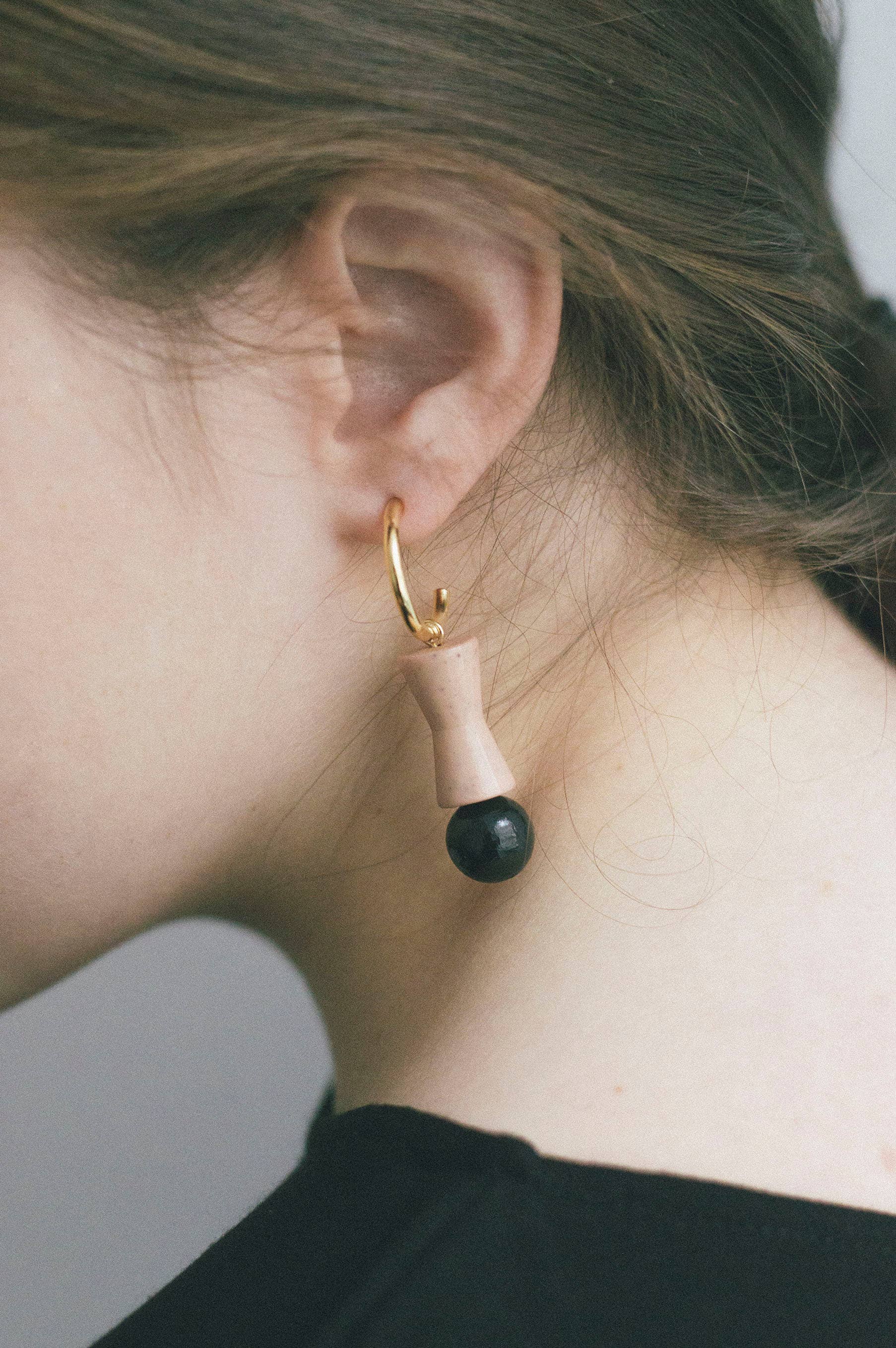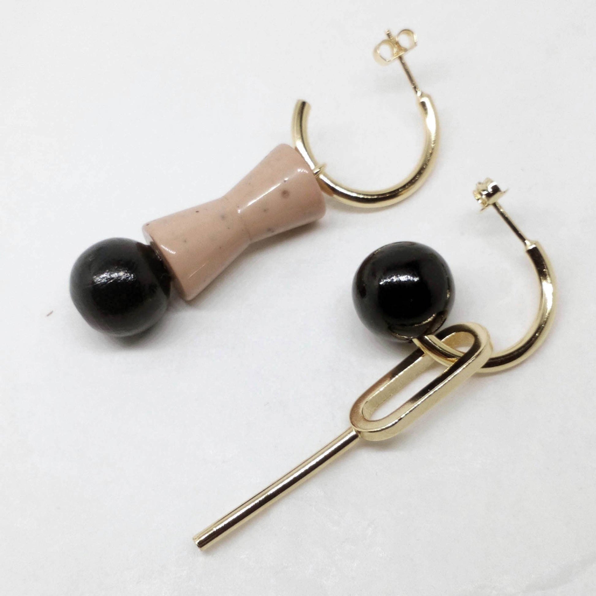 Deze opvallende oorbellen combineren vintage lucite bicones met een zwarte houten kraal, gevat in verguld messing. Licht en speels – ideaal voor dagelijks gebruik én net dat tikje anders.
