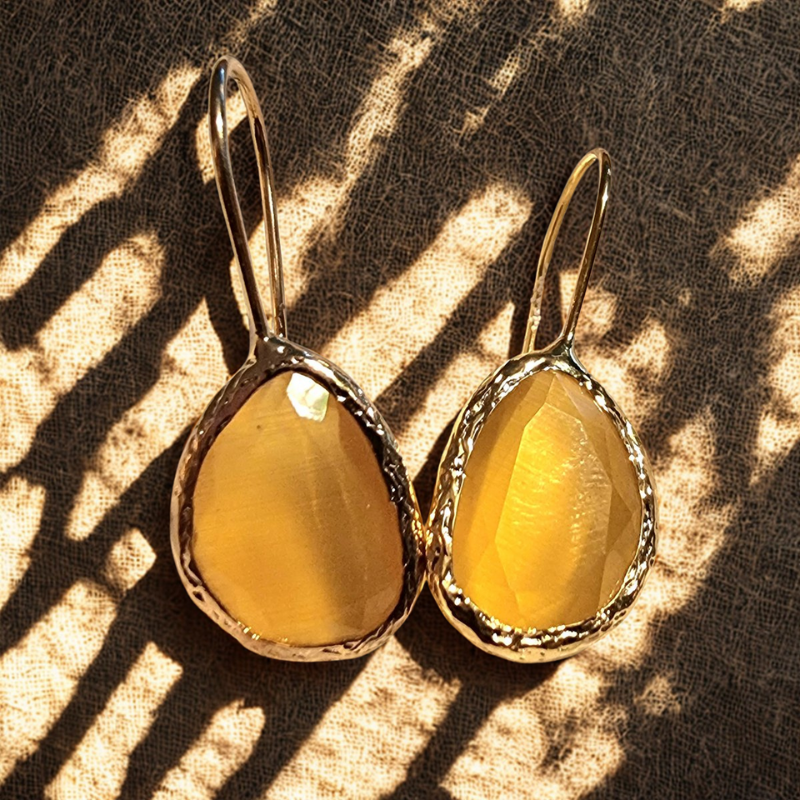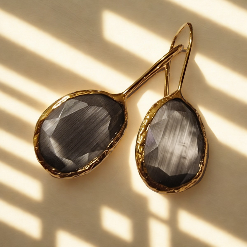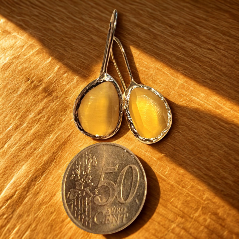 ✨ De cateye steen is een synthetische steen, gemaakt in het laboratorium uit natuurlijke materialen zoals kwartszand, onder hoge druk en hitte – daardoor krijgt ze haar kenmerkende glans en diepte.