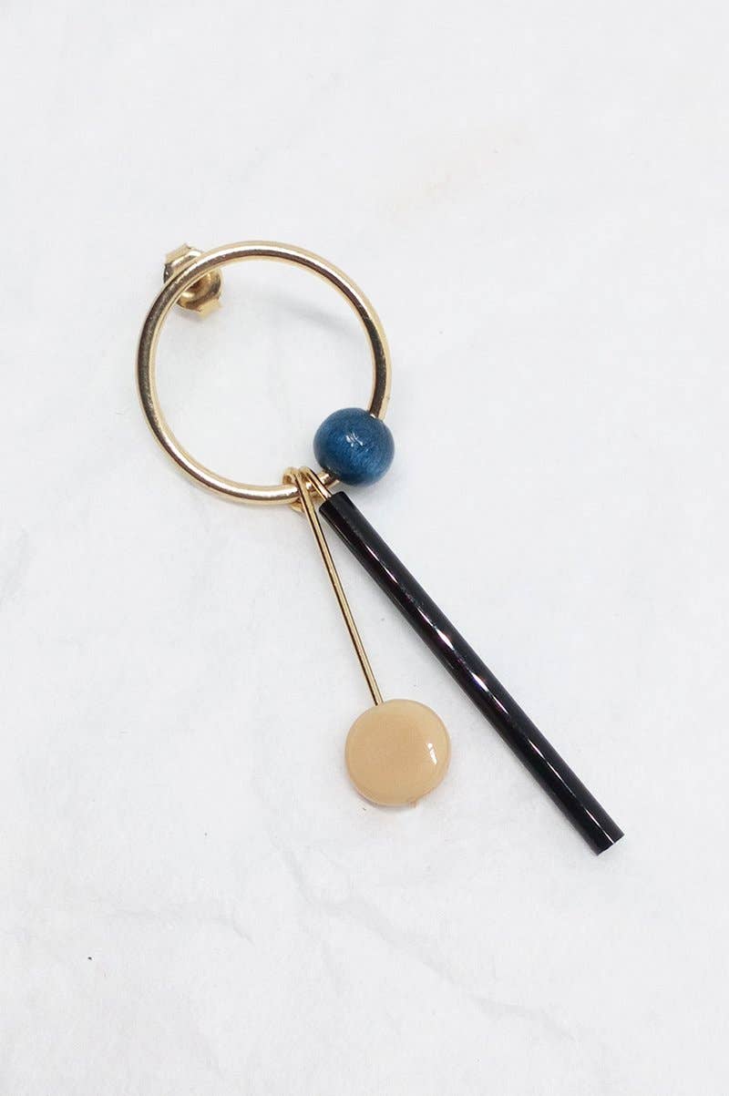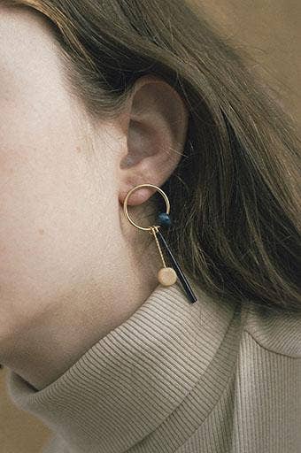 Een zwarte glazen buis en houten kraal rusten op een vergulde messing voet. Lichtgewicht en stijlvol – voor wie houdt van een vleugje grafische eenvoud met warme accenten.