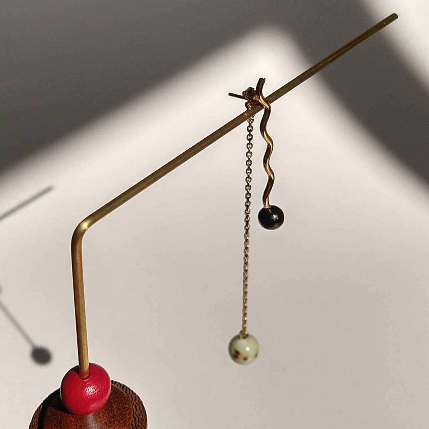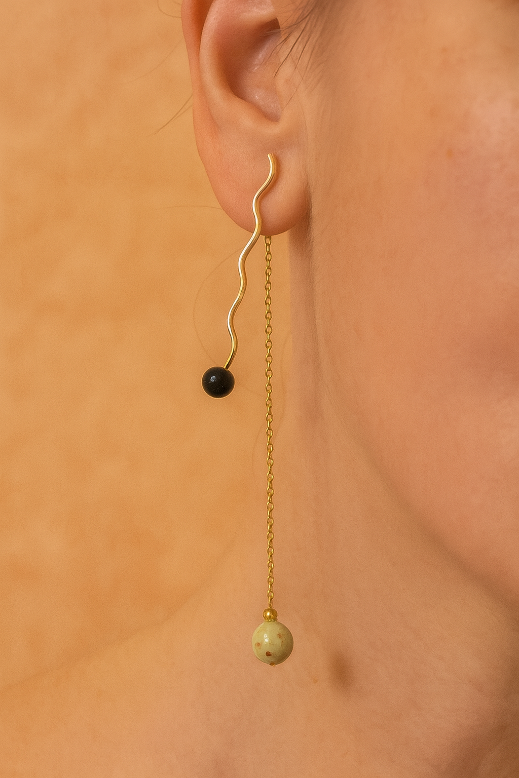 Verguld messing omlijst een kraal van mintgroen glas en een houten accent in diep zwart. Lichtgewicht en toch uitgesproken – een spel van kleur en vorm dat subtiel blijft.
