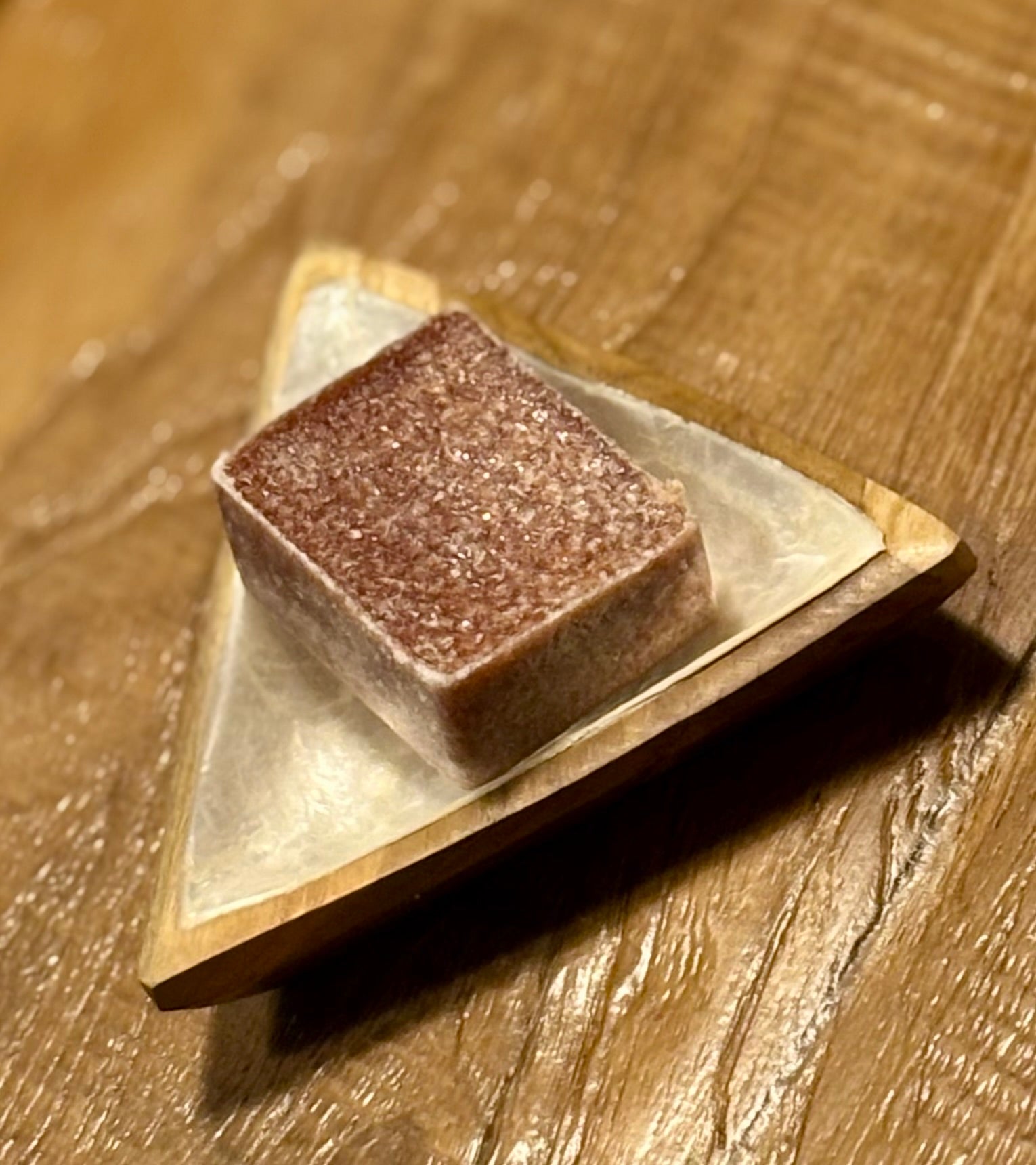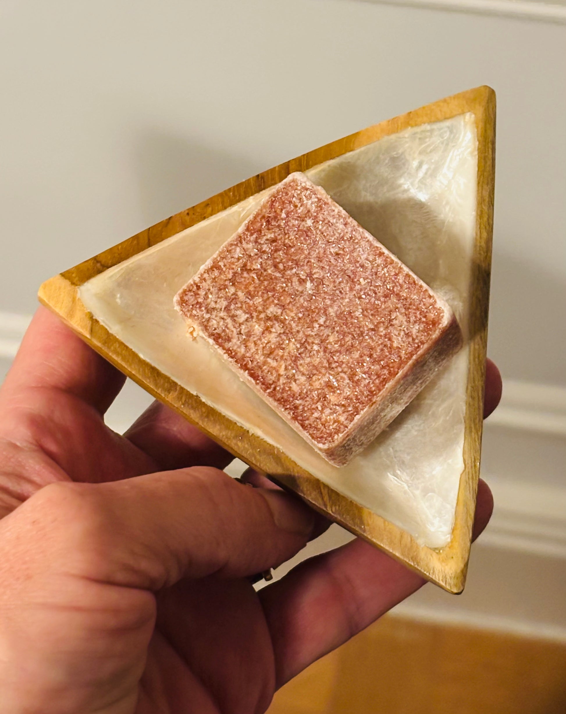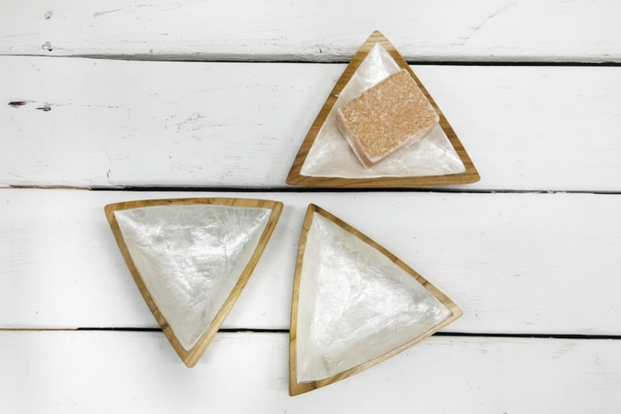 Handgemaakt hout met een inleg van capiz schelp — licht, functioneel en zacht aanwezig.