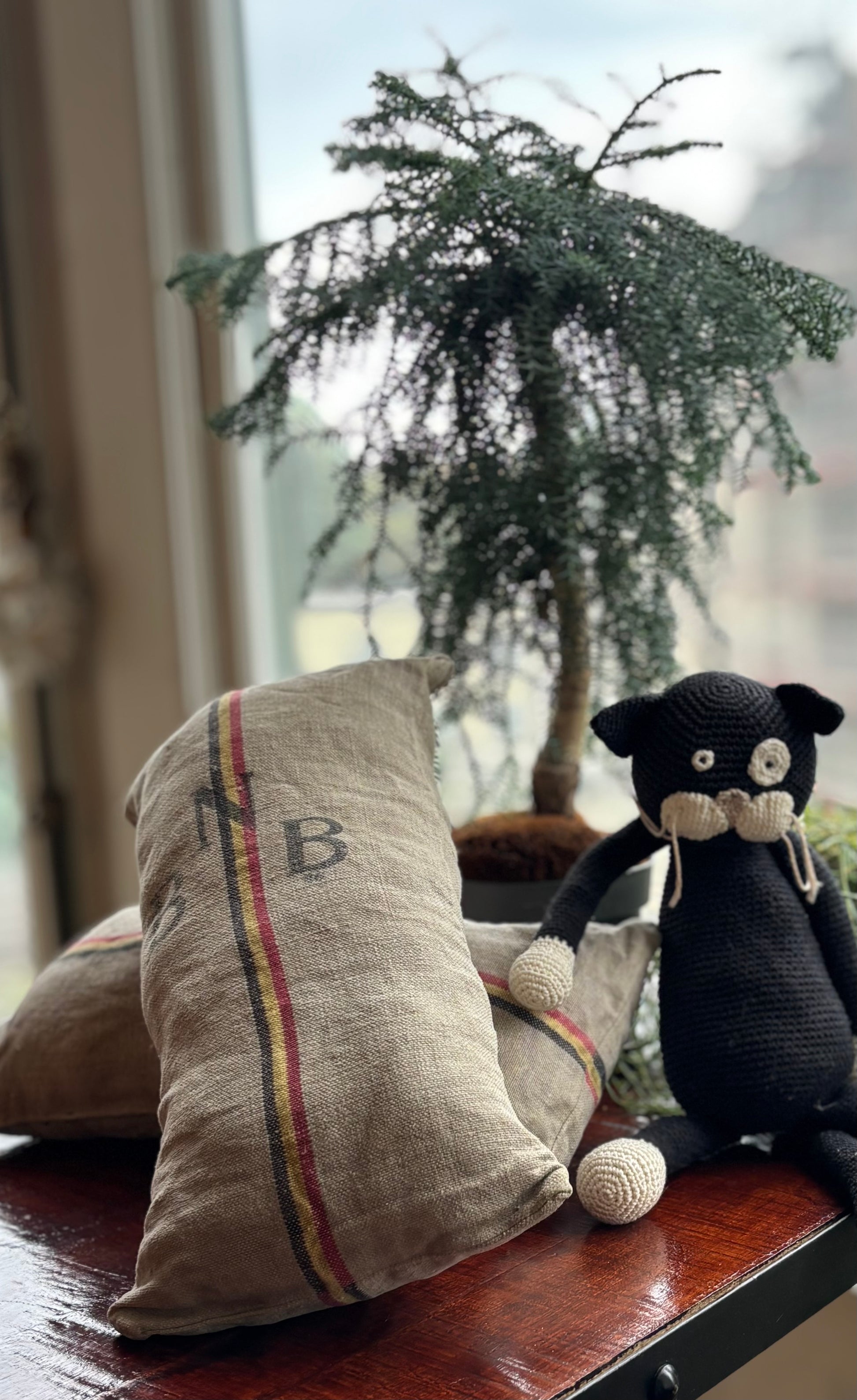 Deze unieke set van twee kussens is vervaardigd uit originele geldzakken van de Nationale Bank van België — stevige linnen zakken die ooit munt en bankbiljetten droegen.