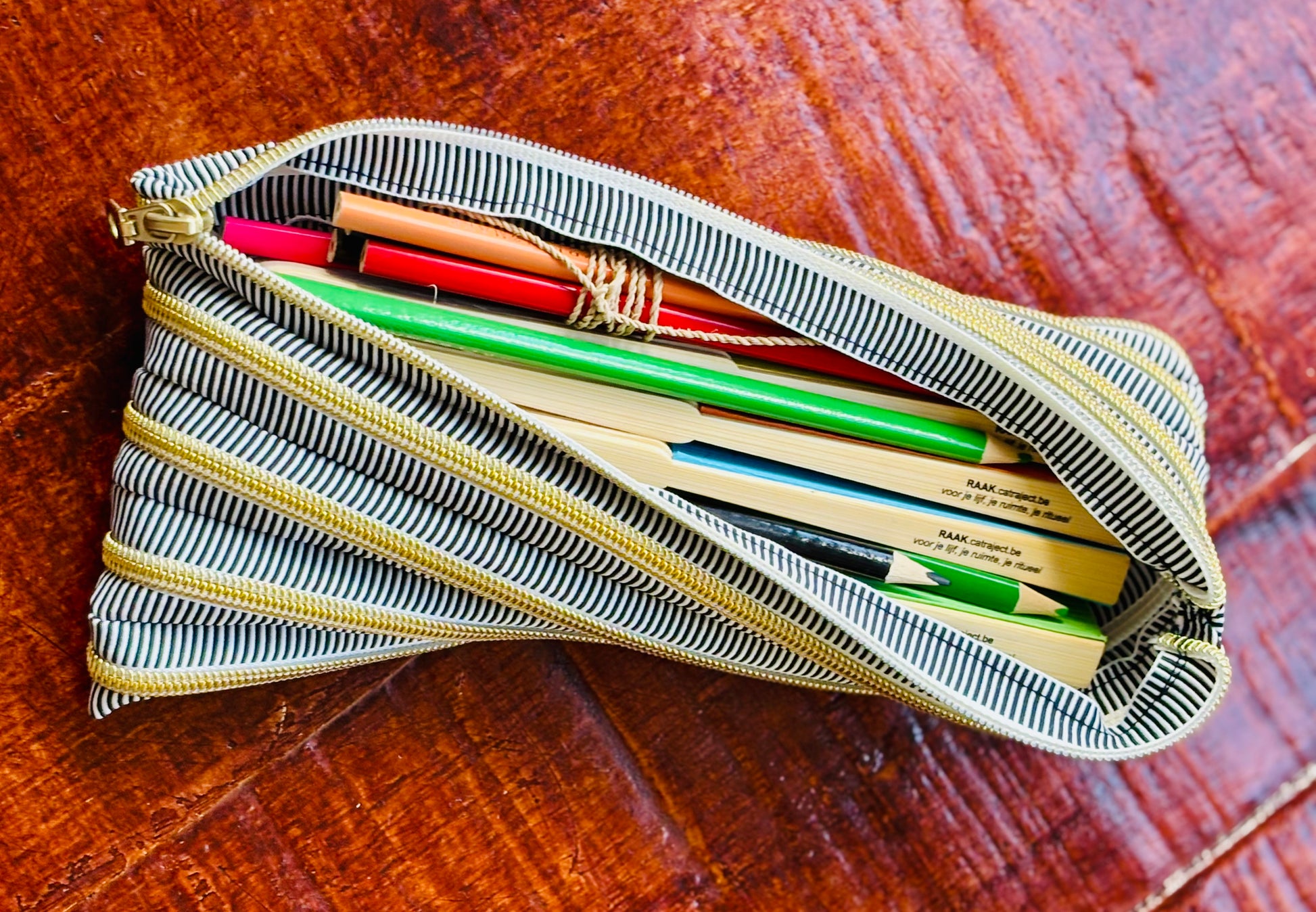 Deze pennenzakken zijn gemaakt uit een rits van maar liefst 2,70 m lang. Afgewerkt tot een handig formaat van ca. 10 × 26 cm, perfect om pennen, make-up of andere essentials in stijl bij je te dragen.